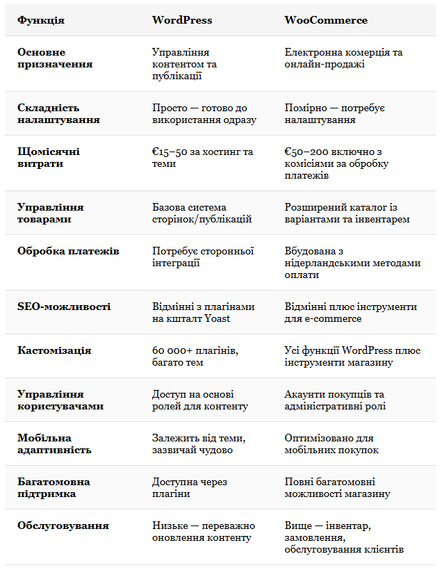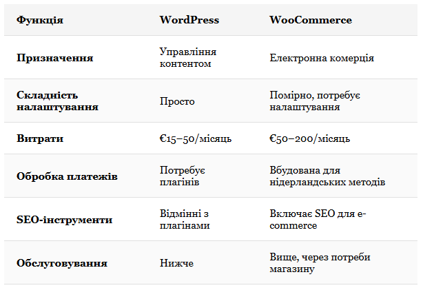 Порада: Багато нідерландських компаній починають із WordPress для управління контентом і додають WooCommerce пізніше, коли їхні продажі зростають. Це масштабоване рішення, яке відповідає змінним потребам.